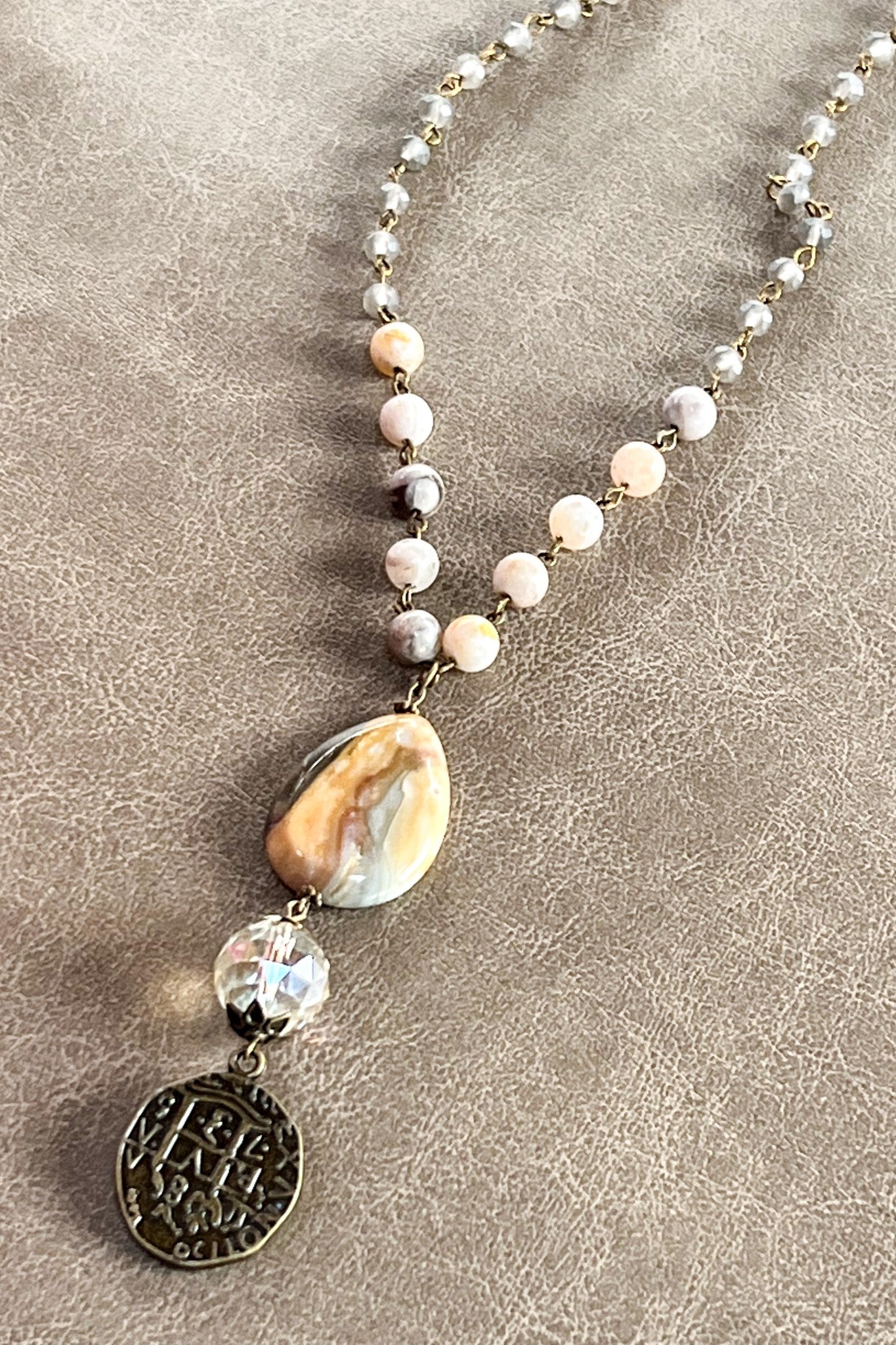 Long, skinny necklace with beautiful natural stones and beads on a chain link. Includes a long charm which includes a doubloon coin, a crystal bead with floral bead ends and a polished agate stone.