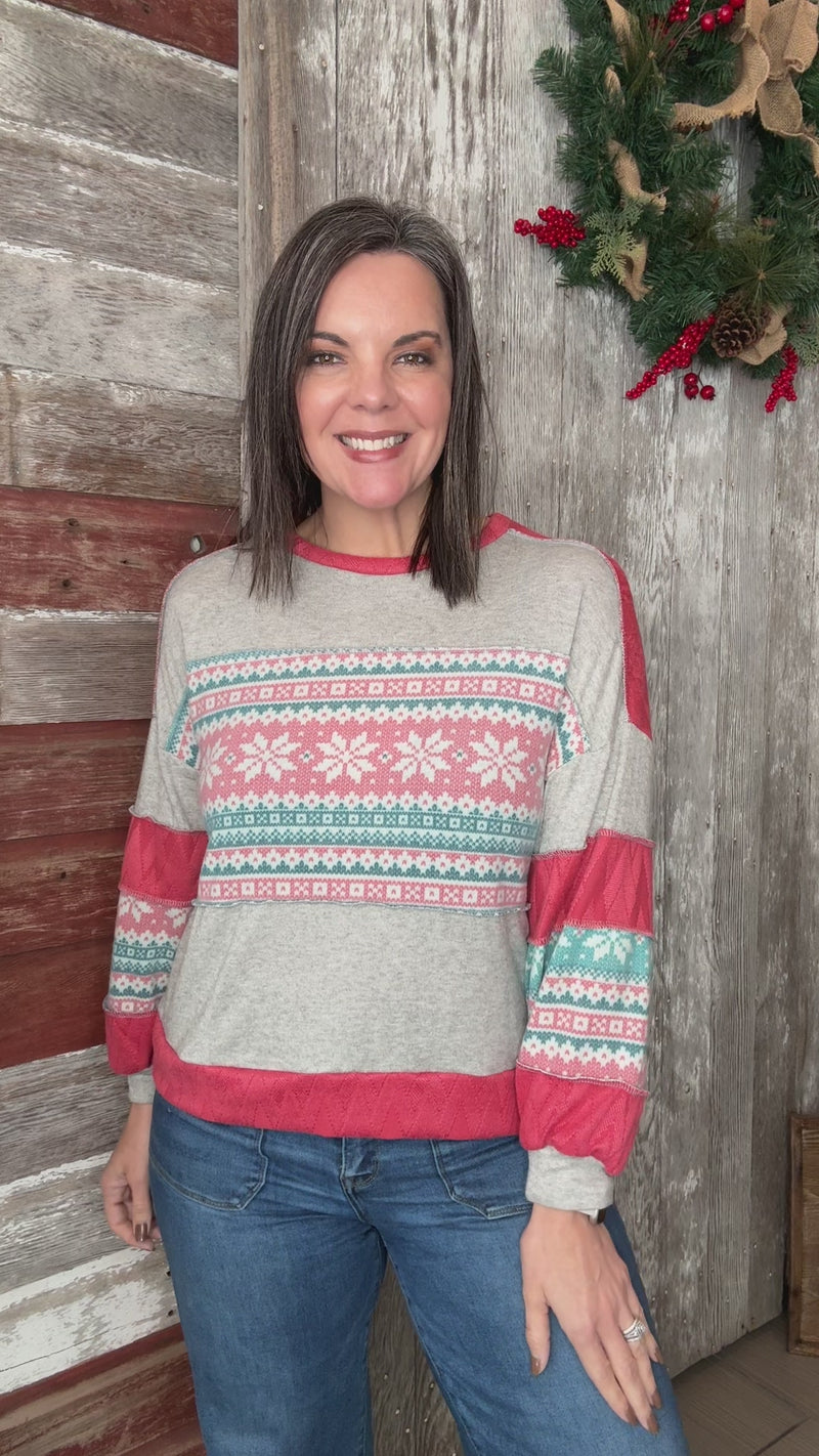 Embrace the season in this charming Grey Nordic Patterned Pullover, designed to keep you cozy and festive. The playful bubble sleeves add a touch of whimsy, while the classic round neckline offers timeless comfort. Cheerful color block details bring visual interest and that perfect winter-ready vibe. Whether you're gathering with loved ones or enjoying quiet moments by the fire, this pullover wraps you in warmth and holiday spirit. A versatile piece that celebrates the joy of the season while keeping you feeling your best.