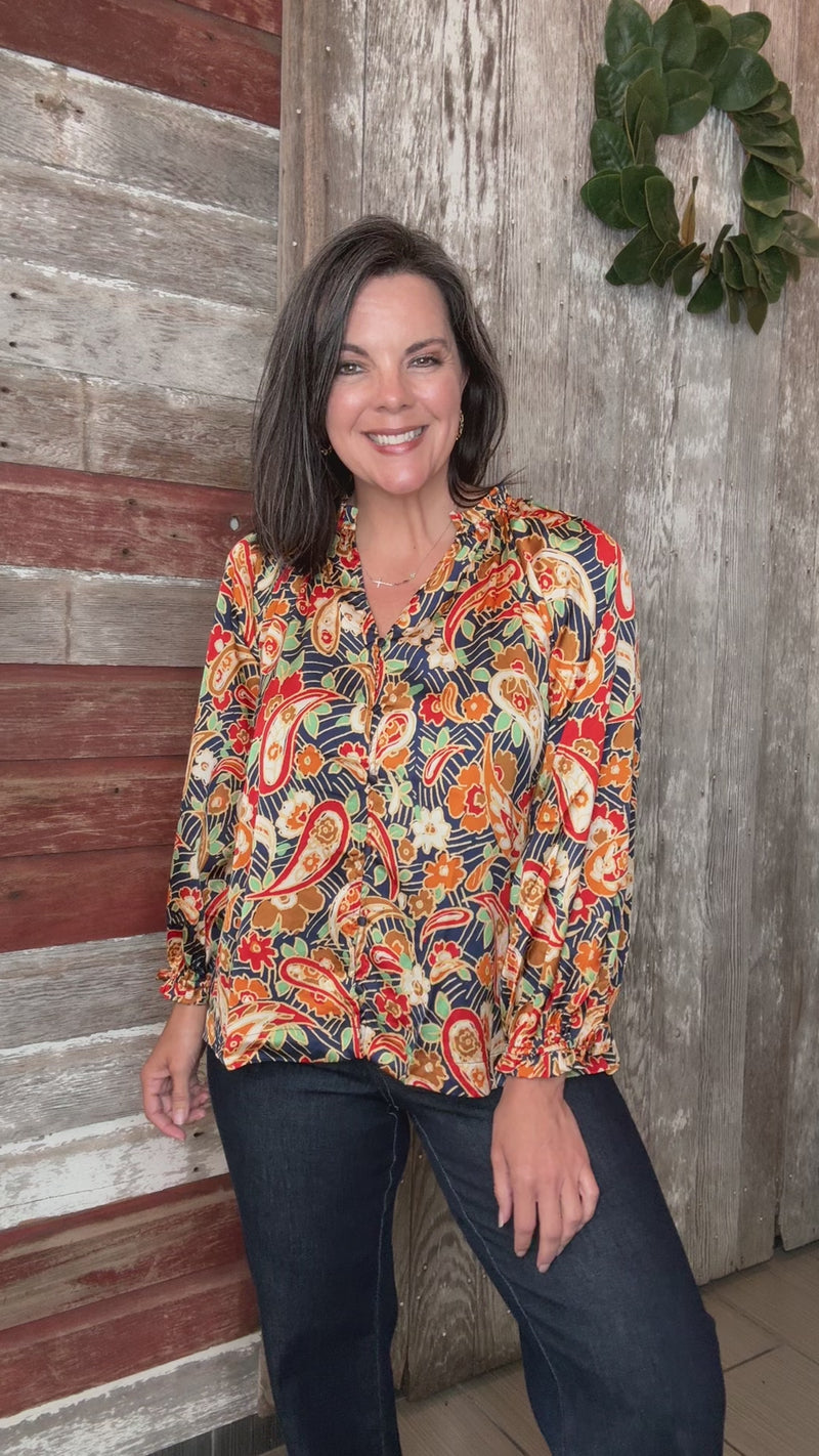 Elevate your wardrobe with this Navy Satin Paisley Blouse, featuring a refined slight V-neck that adds subtle sophistication. The ruffled hem details enhance its graceful silhouette, while fabric-covered buttons provide a polished finish. Designed with an oversized fit, this blouse offers both comfort and effortless style, perfect for dressing up or layering.