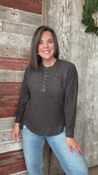 A customer favorite from last year! The Brushed Melange Henley Sweater features a 7-button placket for customizable comfort. Its relaxed fit ensures easy movement and all-day wearability. Designed with a high-low round hemline, it adds a modern silhouette that pairs effortlessly with any casual or layered outfit. Perfect for refined, everyday style.