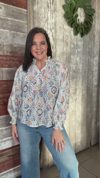 Crafted from delicate woven eyelet material, this baby blue blouse features a flattering notched V-neckline and functional button front closure. Smocked wrists add a charming, tailored detail while providing a comfortable fit. Perfect for layering or wearing solo, this piece combines classic elegance with everyday wearability.