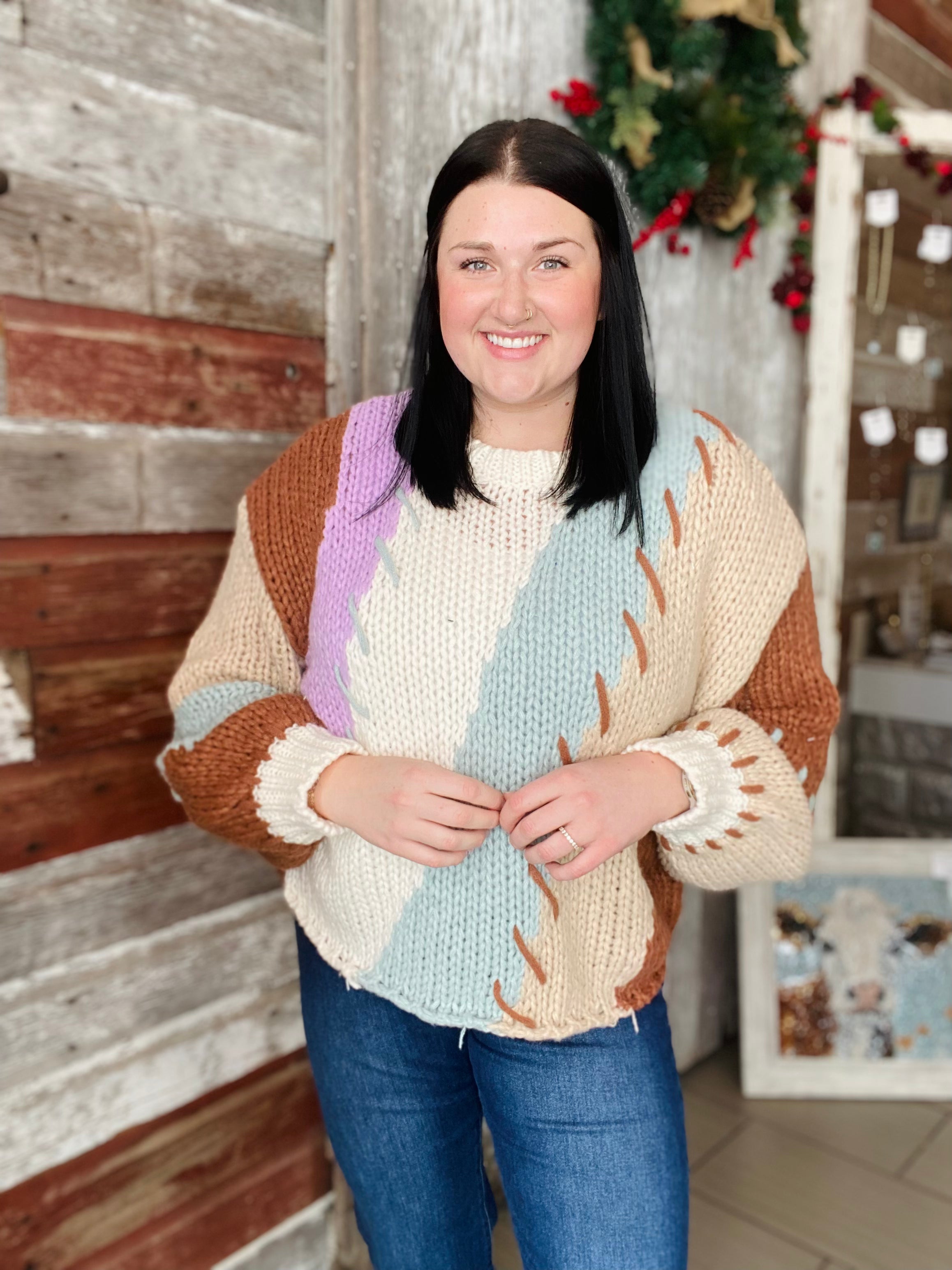 Elevate your winter wardrobe with our Winter Color Block Sweater! This fun piece features a loose knit that keeps you warm and cozy, while the oversized fit adds a trendy touch. The braided details add a touch of uniqueness.