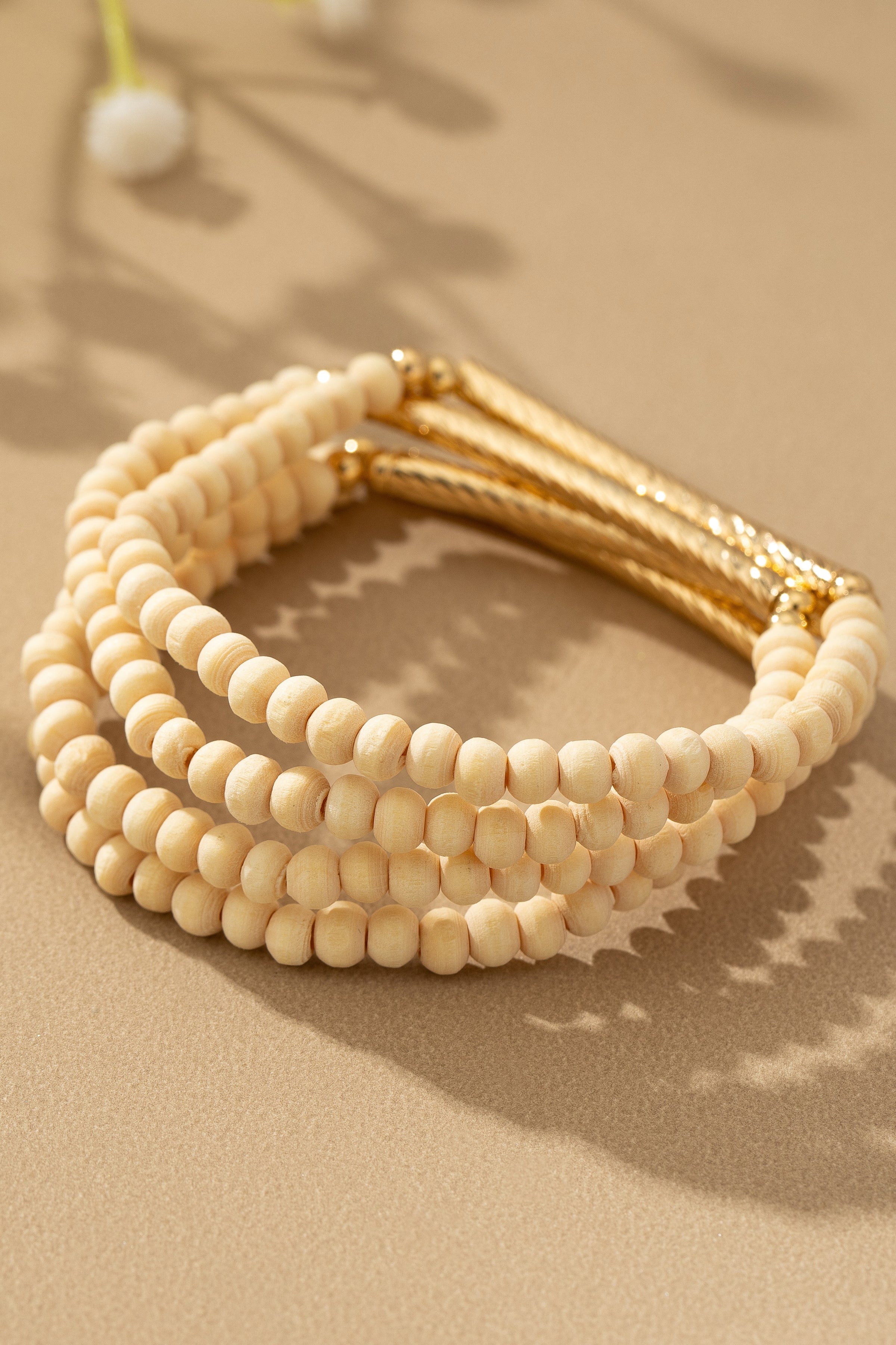 Wooden beaded bangle bracelet set with twisted gold-toned accents. Each set features multiple strands of smooth round beads in earthy tones-ivory, caramel, deep red, or multicolor mixes of green, cream, and brown. The polished gold bands add a refined balance to the rustic matte beads, creating a versatile accessory that transitions effortlessly from casual daytime looks to layered evening styling.